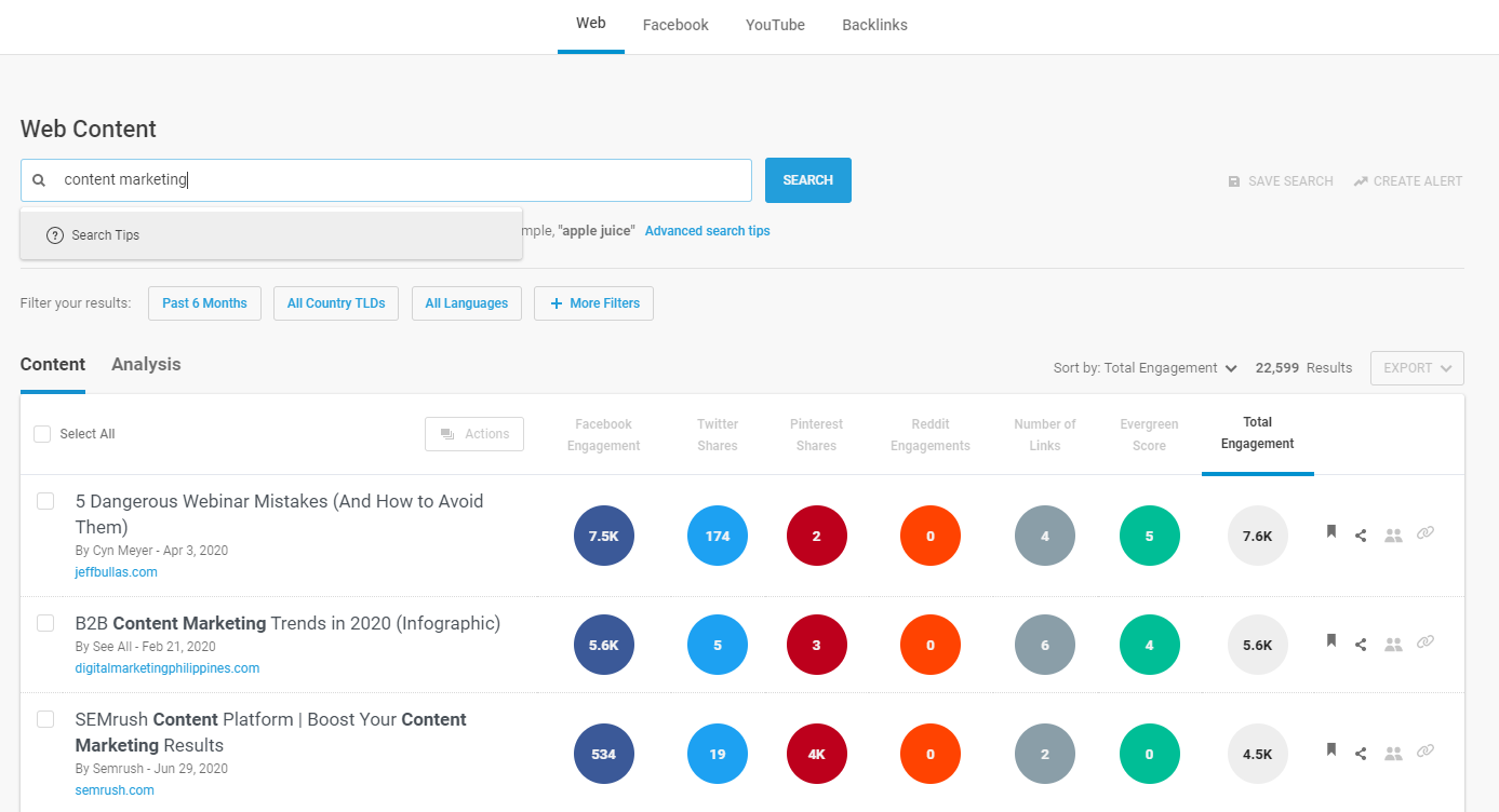 - You can also research top contents for all the platforms (Facebook, Youtube, web) separately