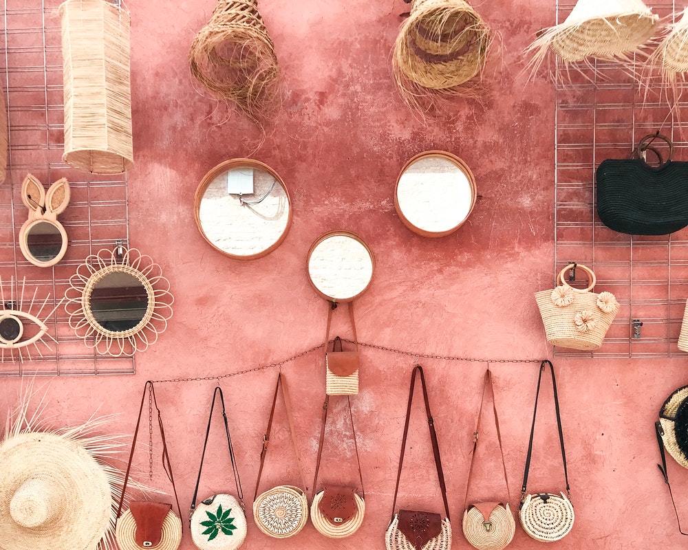 Src: https://www.pexels.com/photo/photo-of-wicker-bags-and-straw-hats-on-a-pink-wall-2766334/